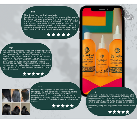 What sets Joy Refined Organics apart is our unwavering commitment to comprehensive approach to skin and scalp wellness, sustainability and ethical practices. We take pride in using eco-friendly packaging and supporting local communities by sourcing our ingredients directly from verified natural and organic South African suppliers. This not only reduces our carbon footprint but also ensures the freshness and efficacy of our products.